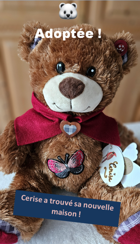 CERISE : Oursonne de moyen format, env. 15-20 cm, accompagnée d'un message de vos anges : CHF 25.- / EUR : 25,00 (frais de port en sus). *** Article non disponible. ***